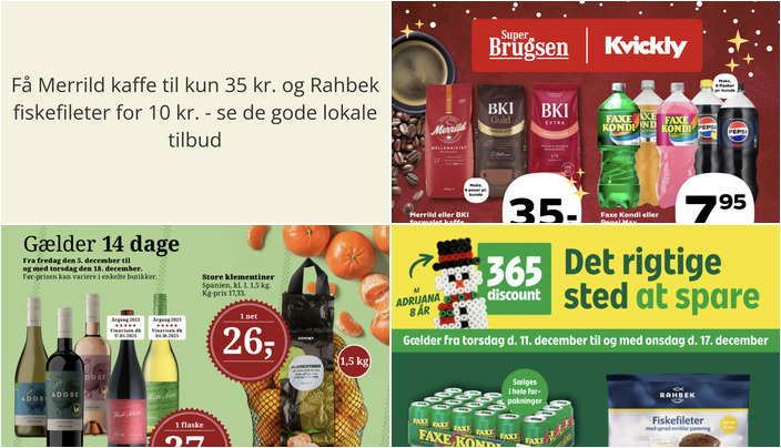 SuperBrugsen tilbyder Merrild eller BKI formalet kaffe i flere varianter (350-400 g) for kun 35 kr. pr. pose. Der er et begrænset parti, og der kan maksimalt købes 6 poser pr. kunde. Tilbuddet gælder fra fredag den 12. december til torsdag den 18. december.